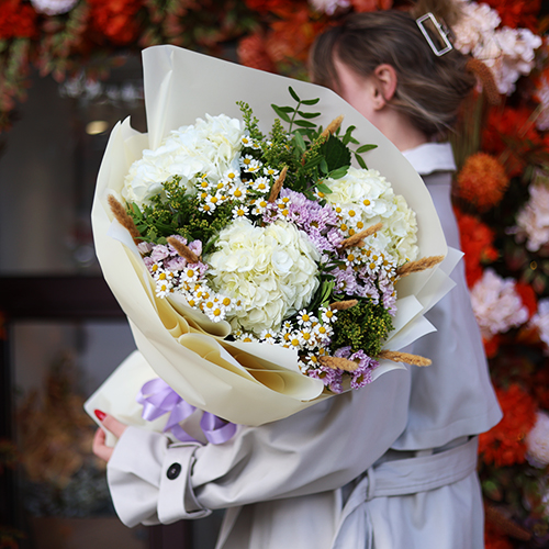 Букет "Zero" из хризантем сантини и гортензий