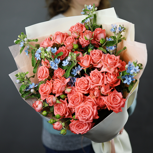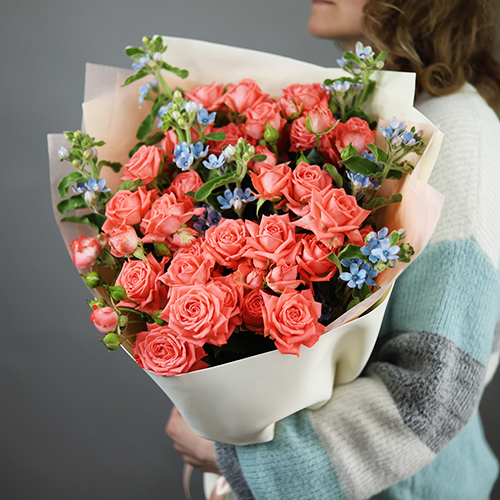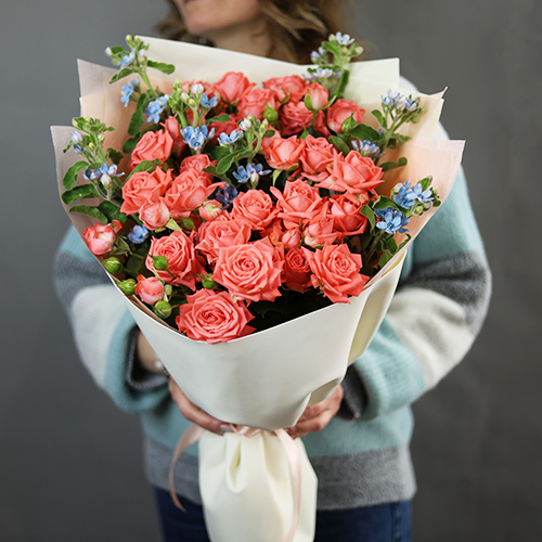 Букет "Фортуна" из коралловых роз и оксипеталума